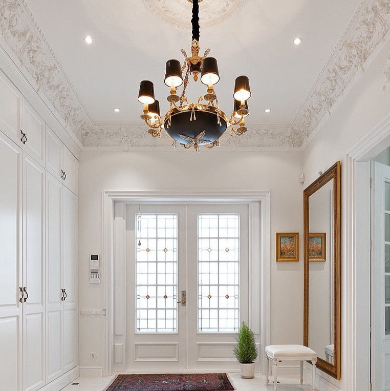 8 Light French Gold Chandelier With Black Shades