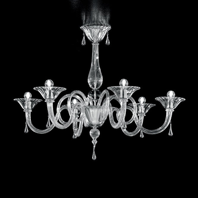 This elegant contemporary handmade Italian Chandelier Lighting crafted from Murano glass is made of six shades positioned on top of drip pans and soaring curved arms.