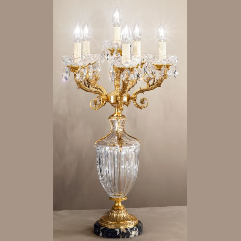 Brass table lamp in a polished real gold finish. The hand-cut crystal details add a touch of elegance to the table lamp. This lamp boasts 6 arms mounted on detailed bobeches that complement the glass detail that surrounds the stem. This lamp is finished with a marble base.