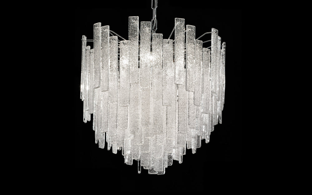 The glasswork of this chandelier is floated and finished using powdered glass which gives it a granulated finish. The glass is available in both clear frosted and gold finishes.