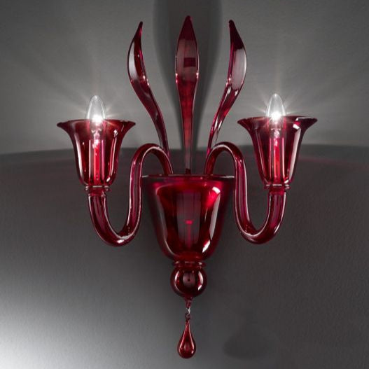An elegant red two-arm Murano glass wall light, hand-blown in the classic Venetian style on the world-famous island, and designed by the Italian architect Alessandro Lenarda.