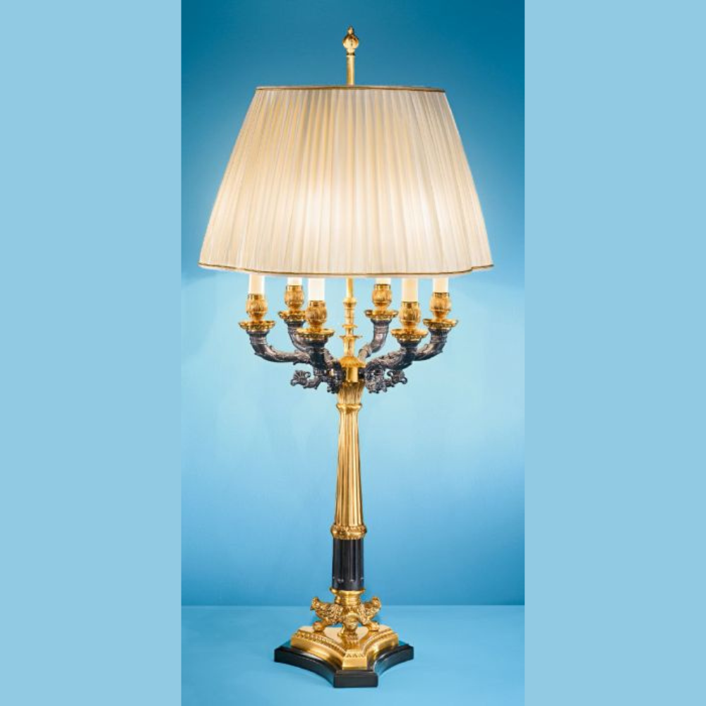 Oversized table lamp made with 'lost wax' cast brass and hand-chiseled details. The matte dark bronze finish of the arms, the antique French gold finish and black marble base give this table lamp a very classic look.