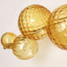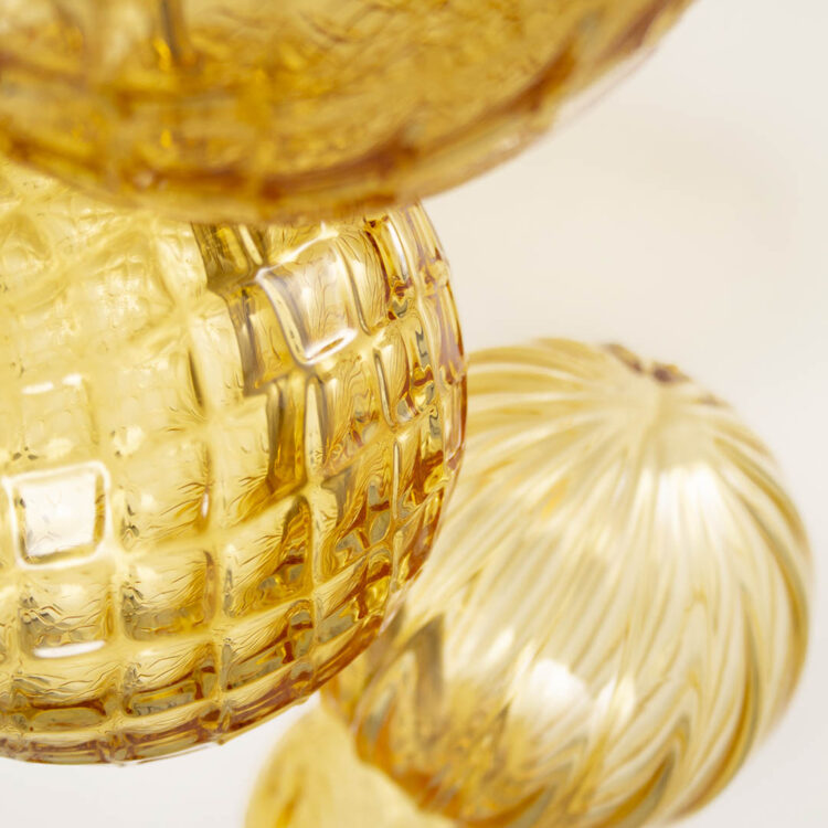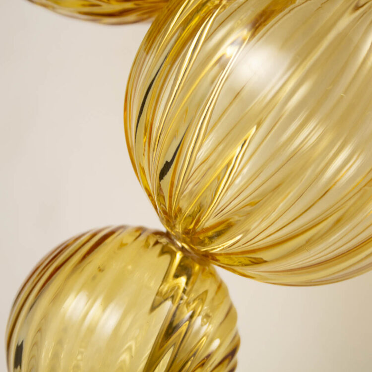 This captivating wall lamp combines classic elegance with modern artistry. The soft glow of the organza lampshade creates a warm ambiance, while the hand-blown amber glass spheres add a touch of sophistication. Each sphere features a unique texture (baloton, rigadin, or ribbed), creating a captivating interplay of light and shadow. The asymmetrical arrangement adds a touch of whimsy, making this lamp a true conversation starter.
